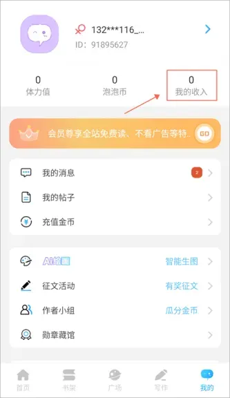 1、首先打开话本小说app进到我的页面,点击“我的收入”