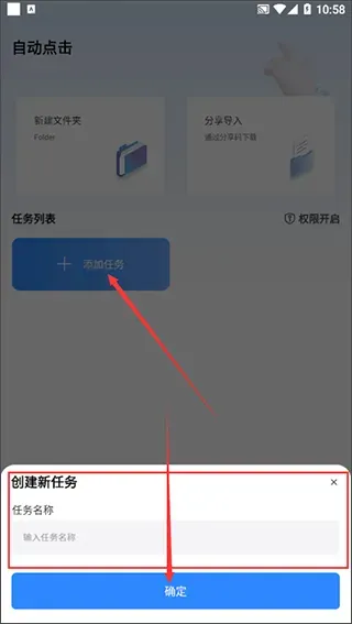 1、打开自动按键点击app,进入软件后授予软件运行所必需的权限,在首页的“任务列表”下点击“添加任务”,输入任务名称,点击确定即可进行下一步;