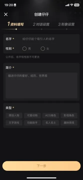 1、资料填写:名字、性别、简介、类型